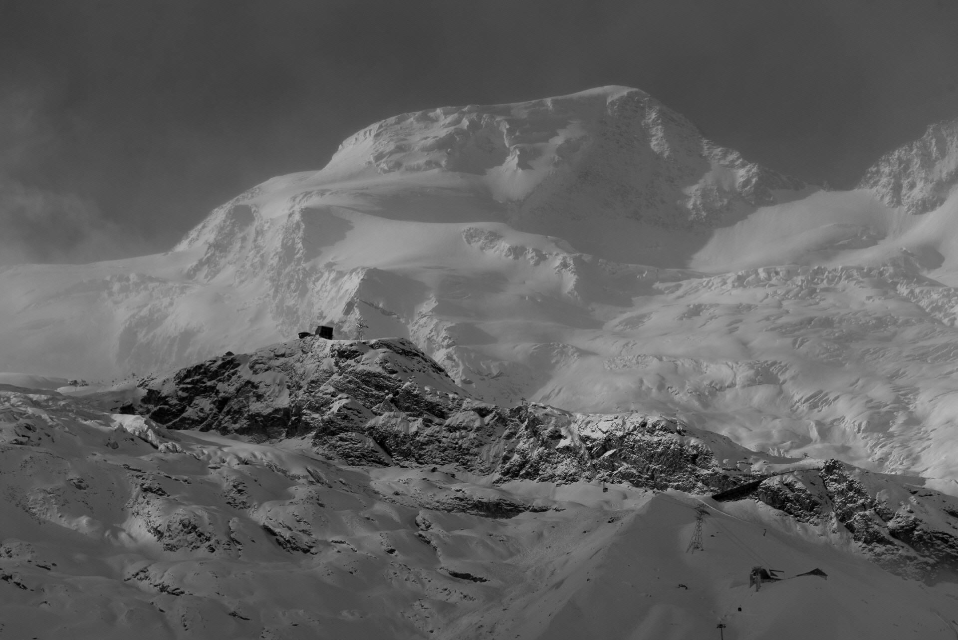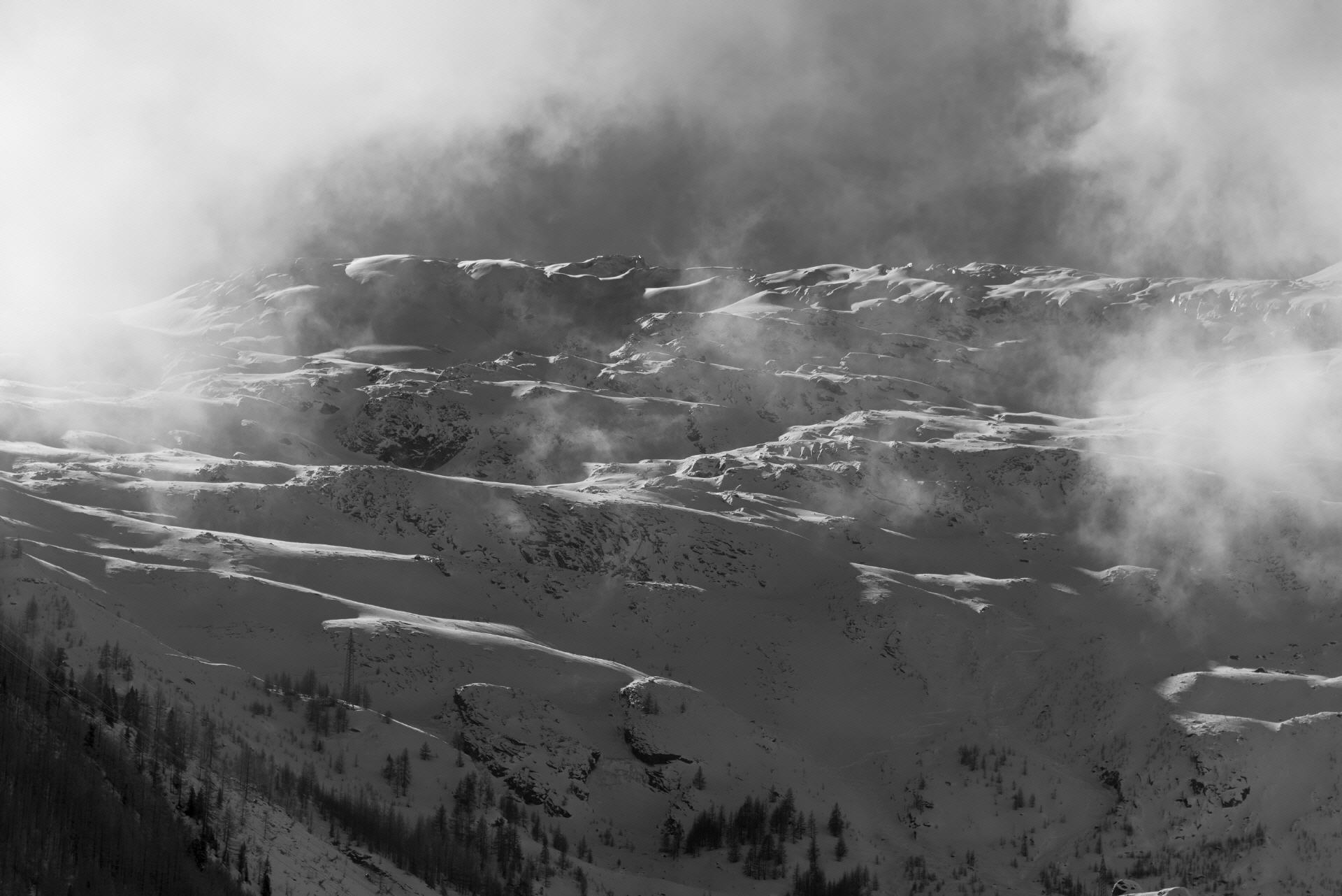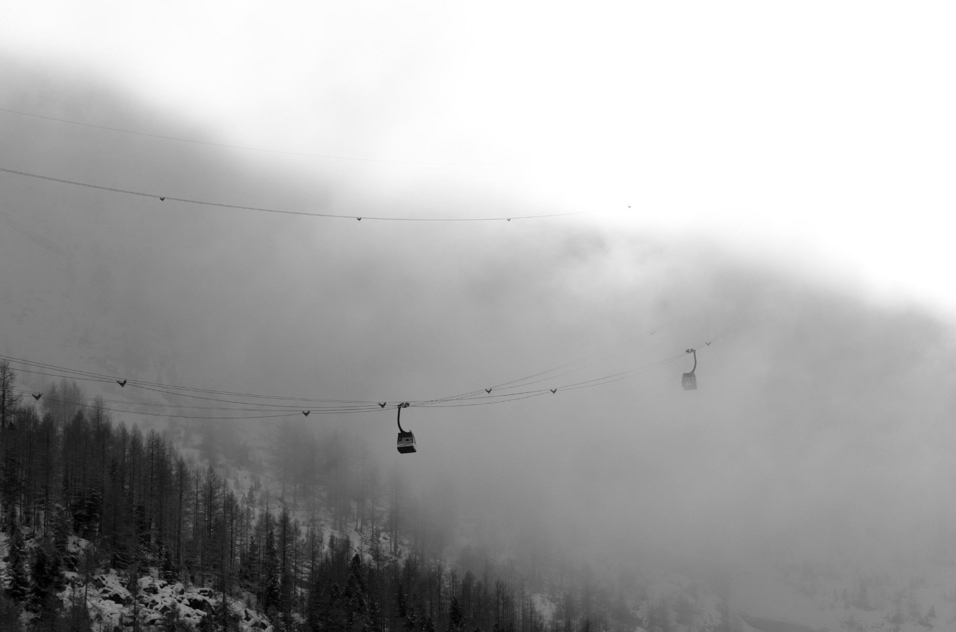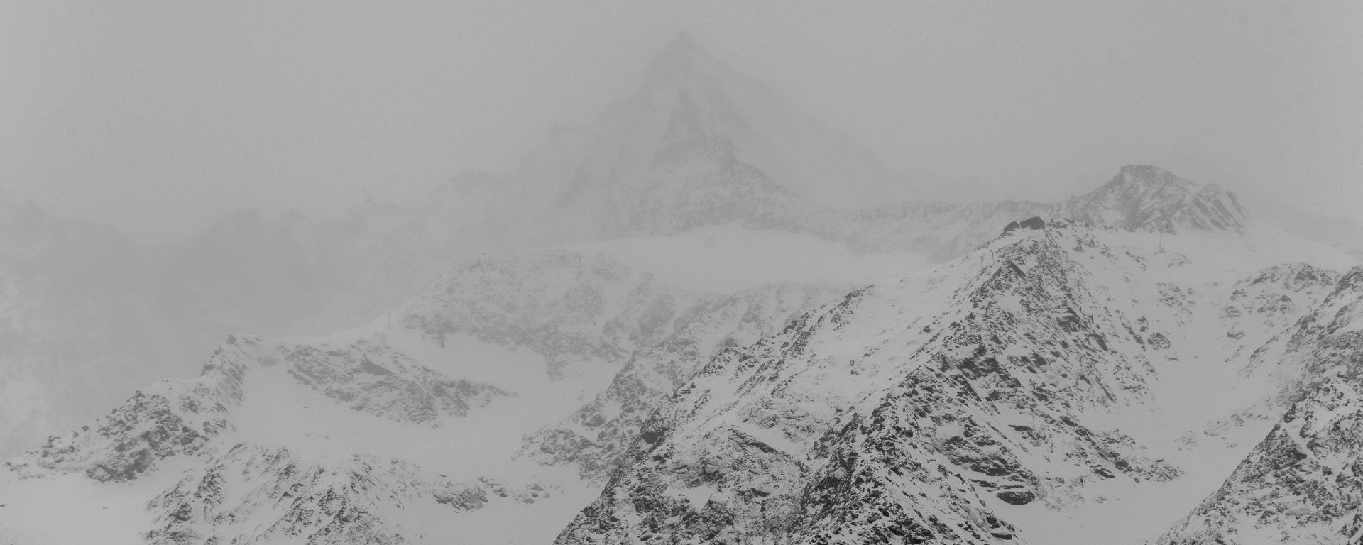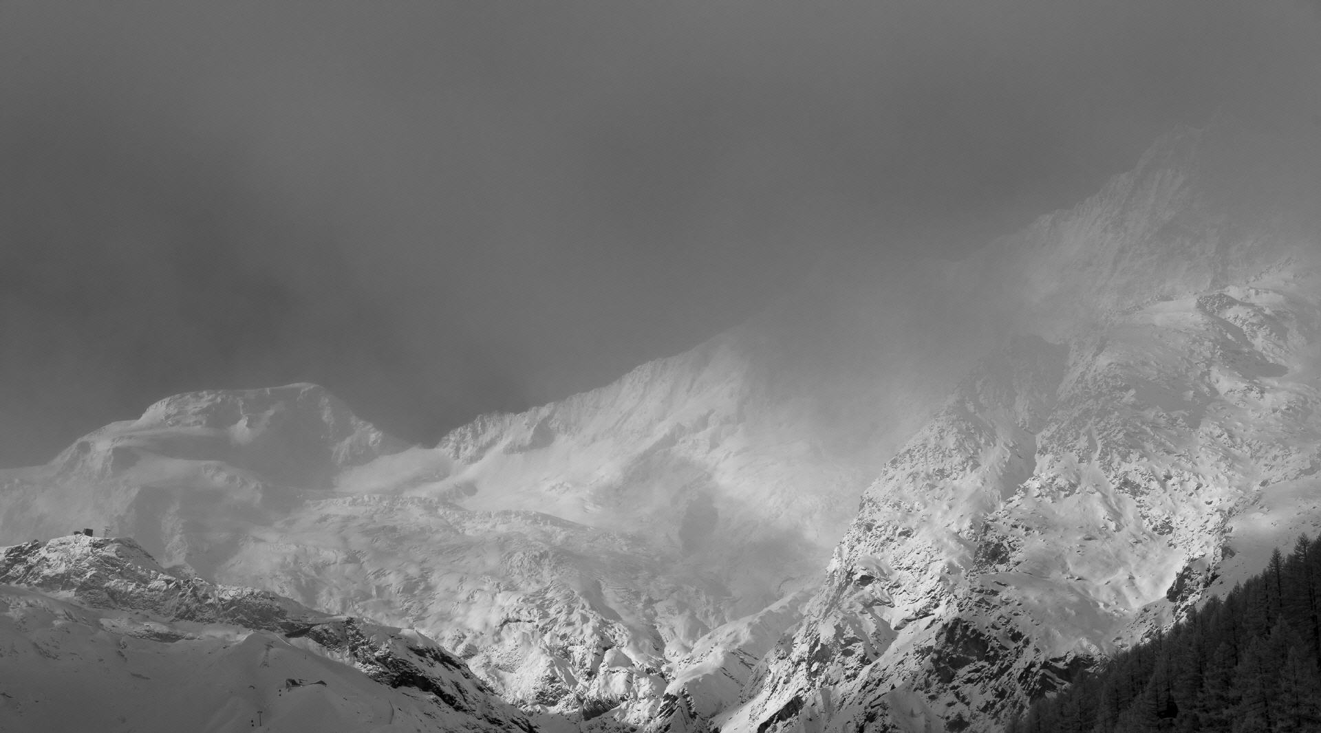 Die Bilder der ersten Serie entstanden am zweiten Tag meines 3-tägigen Aufenthalts in Saas-Fee. Das schwache Licht und der spärliche Schnee sorgten für eine sehr graphische Stimmung. Wunderbar für schwarz/weiss: Es gab sowieso kaum Farbe.