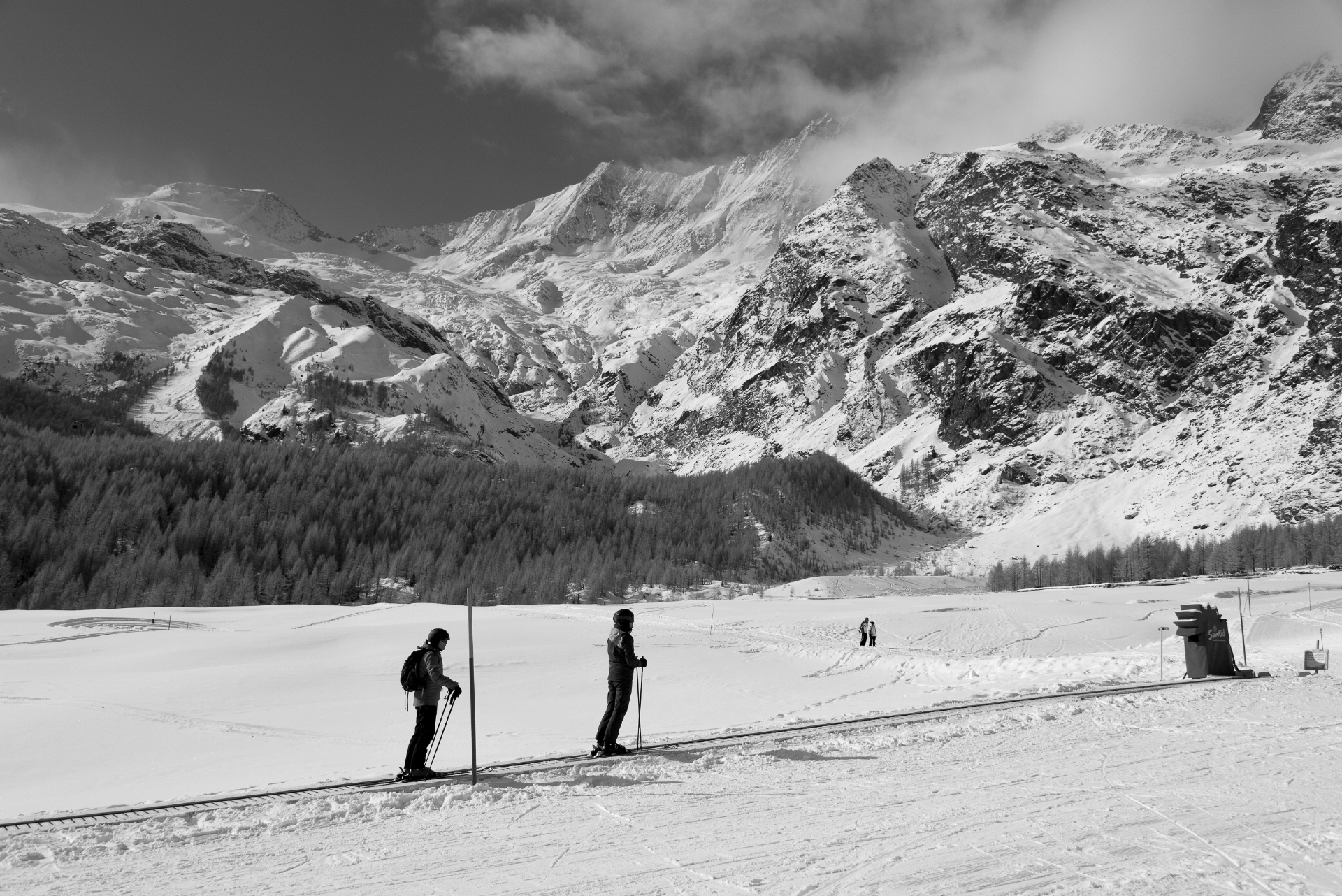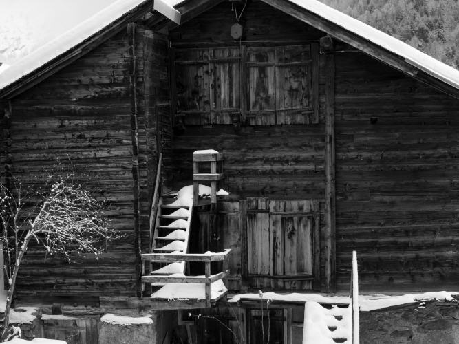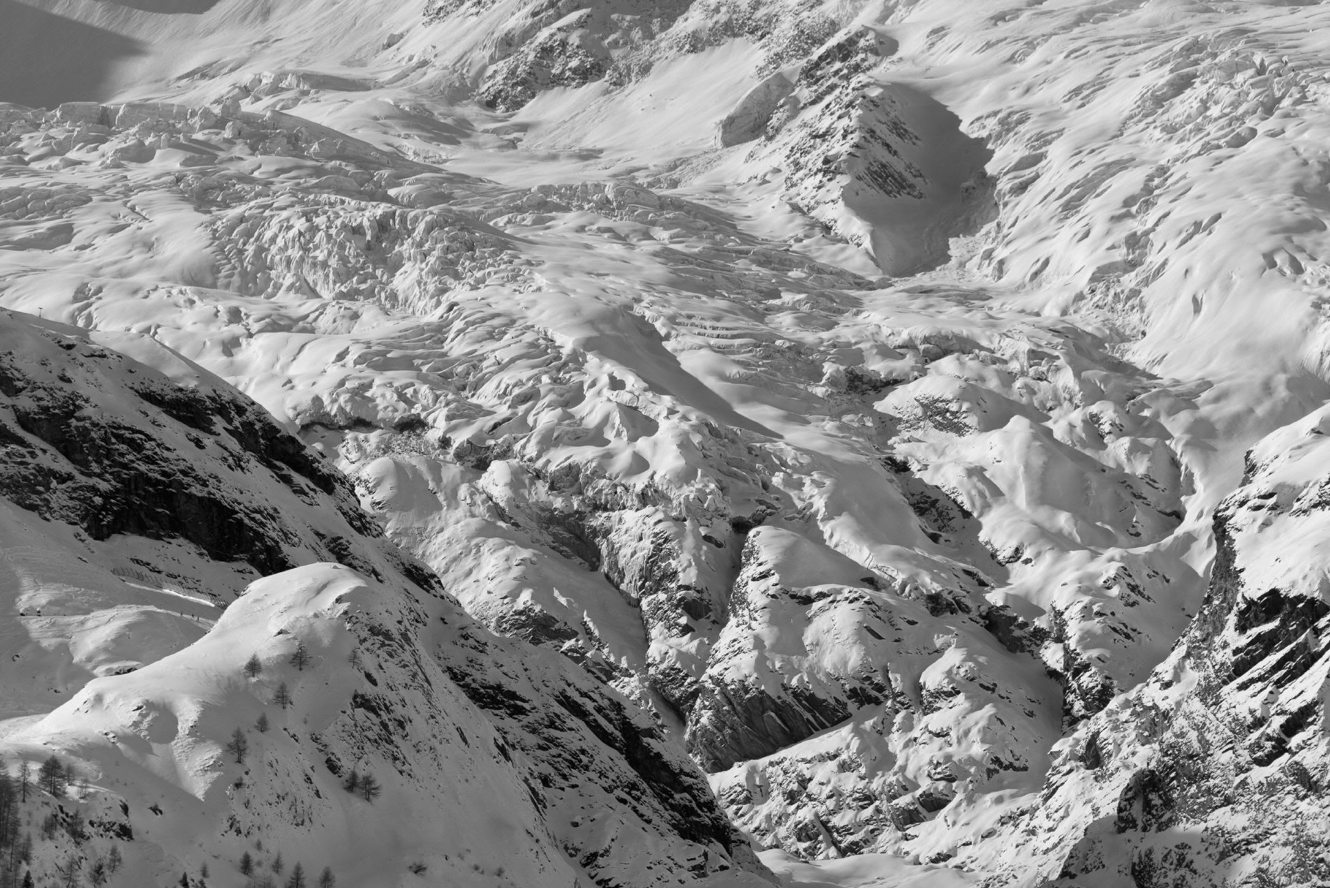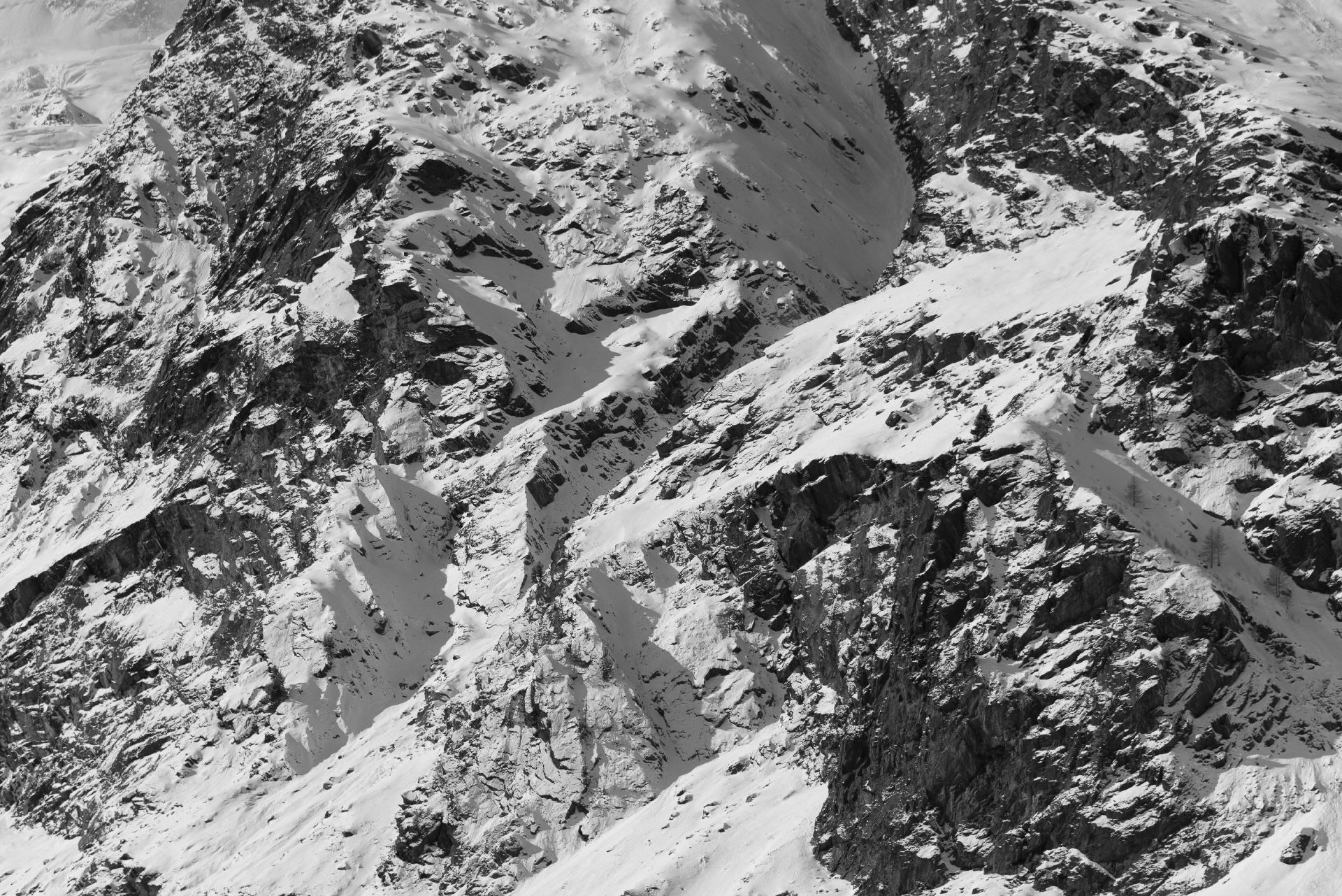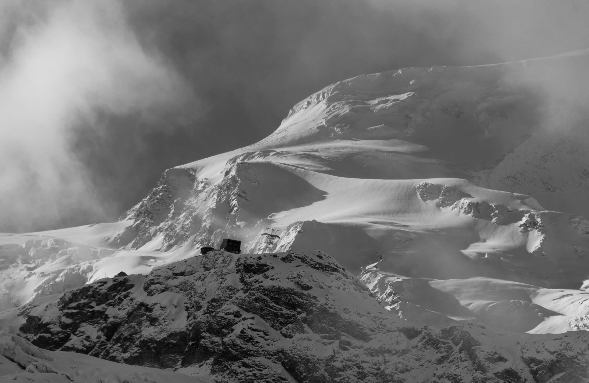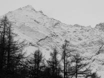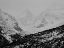 Die Bilder der ersten Serie entstanden am zweiten Tag meines 3-tägigen Aufenthalts in Saas-Fee. Das schwache Licht und der spärliche Schnee sorgten für eine sehr graphische Stimmung. Wunderbar für schwarz/weiss: Es gab sowieso kaum Farbe.