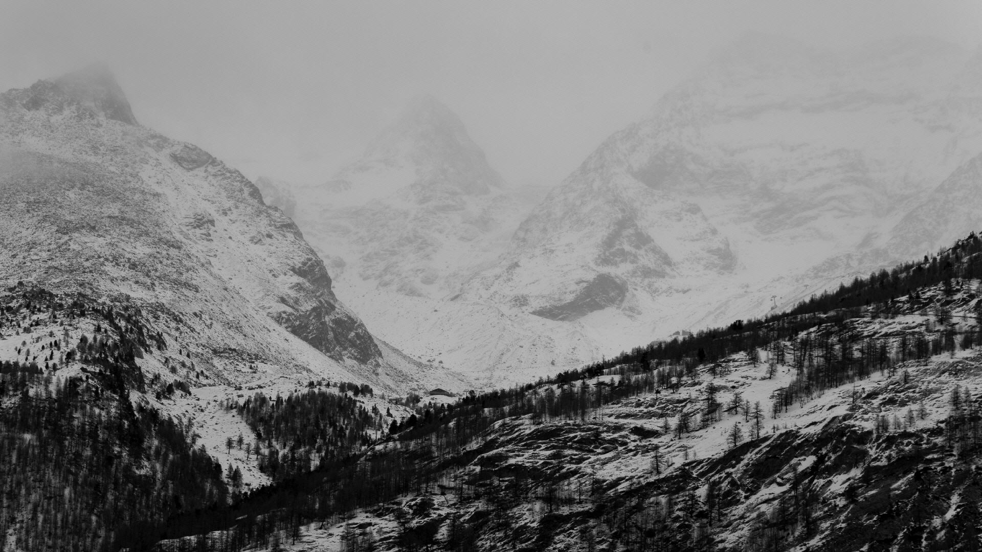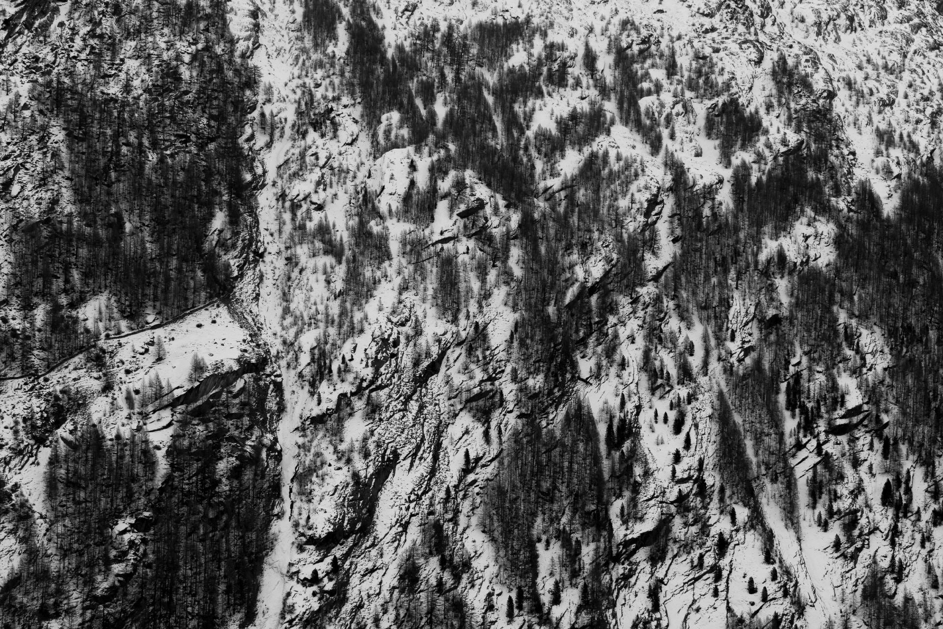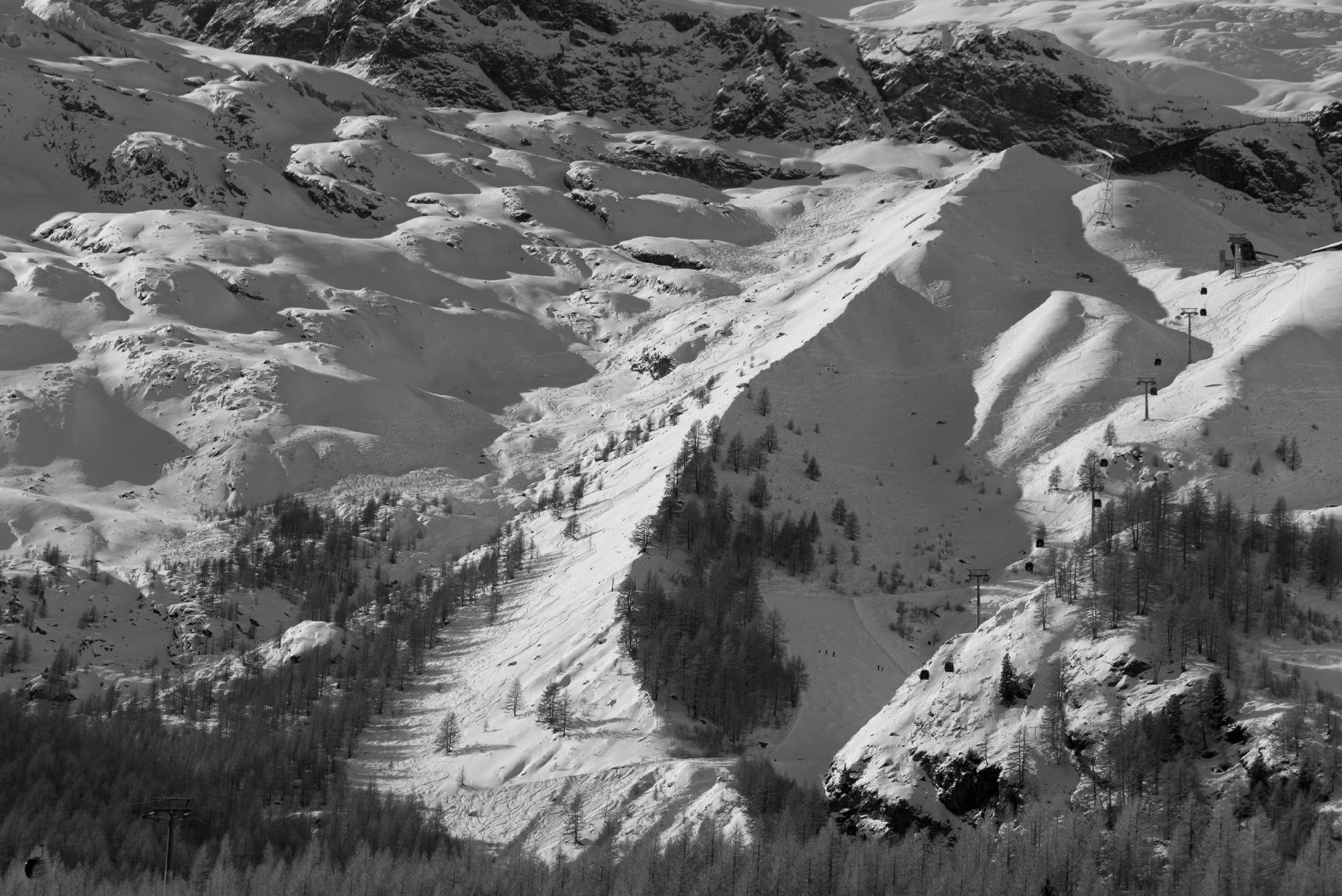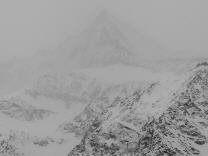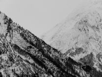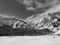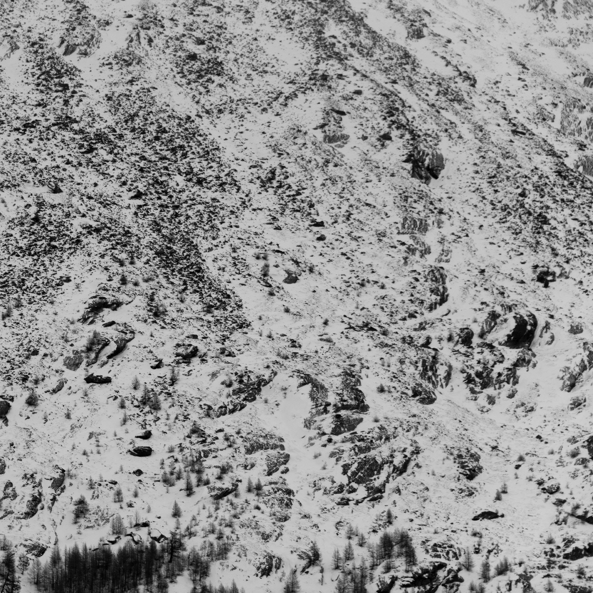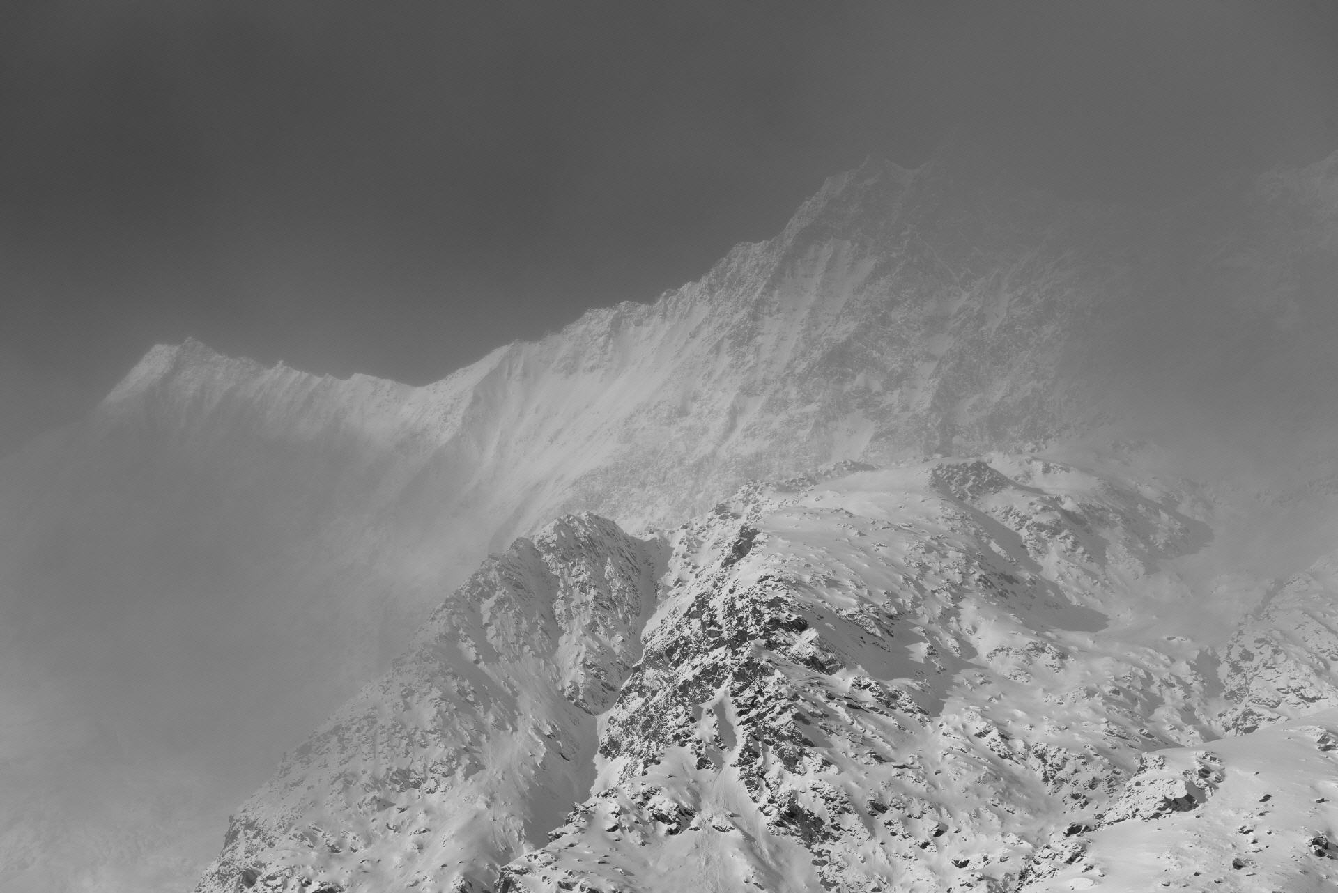 Die Bilder der ersten Serie entstanden am zweiten Tag meines 3-tägigen Aufenthalts in Saas-Fee. Das schwache Licht und der spärliche Schnee sorgten für eine sehr graphische Stimmung. Wunderbar für schwarz/weiss: Es gab sowieso kaum Farbe.