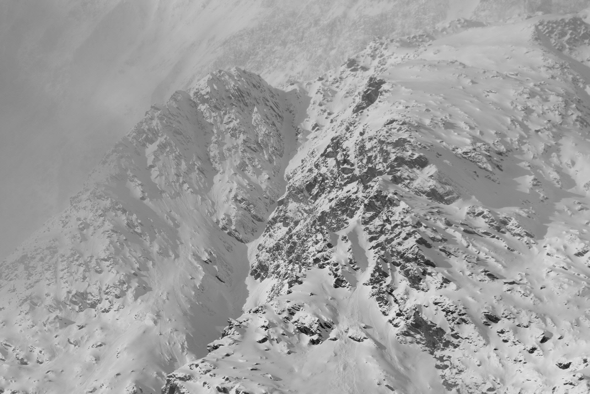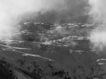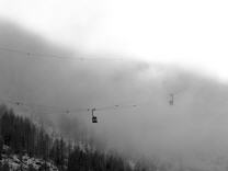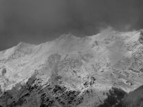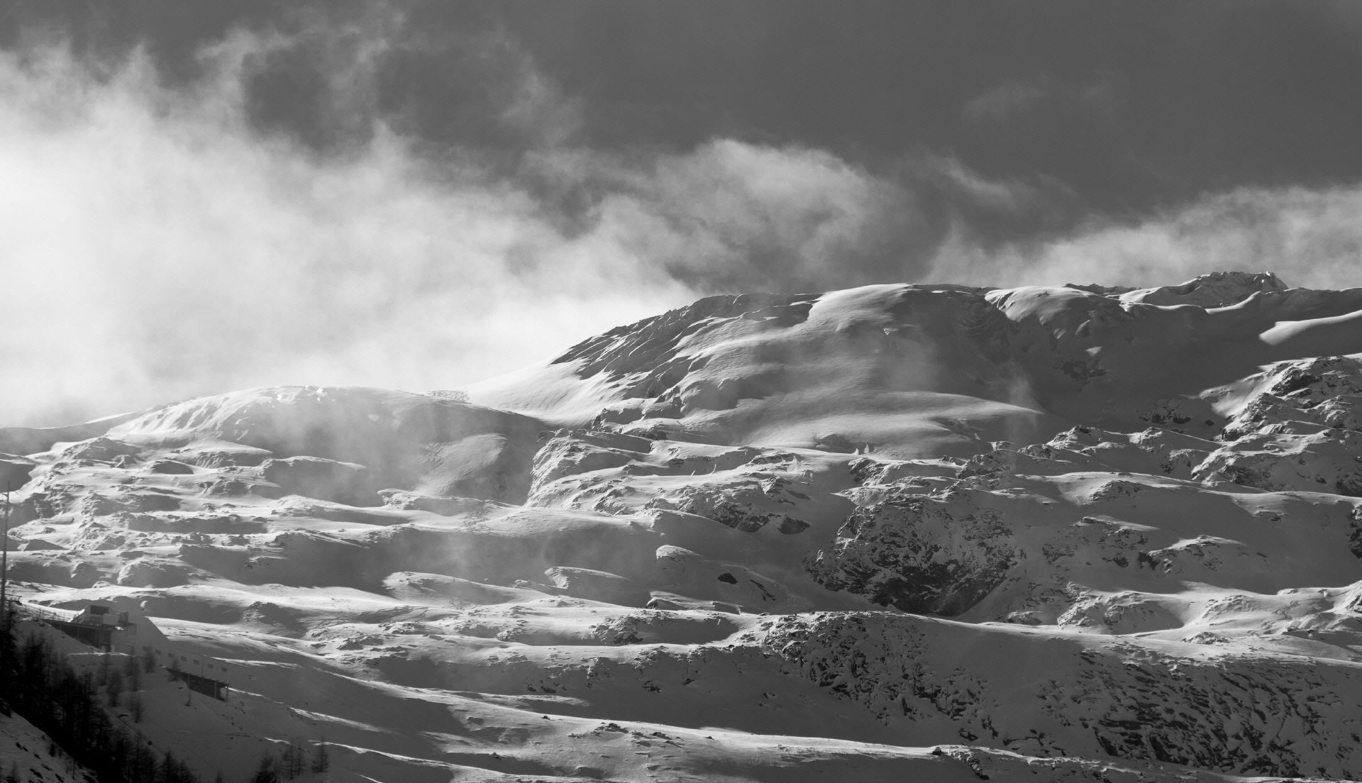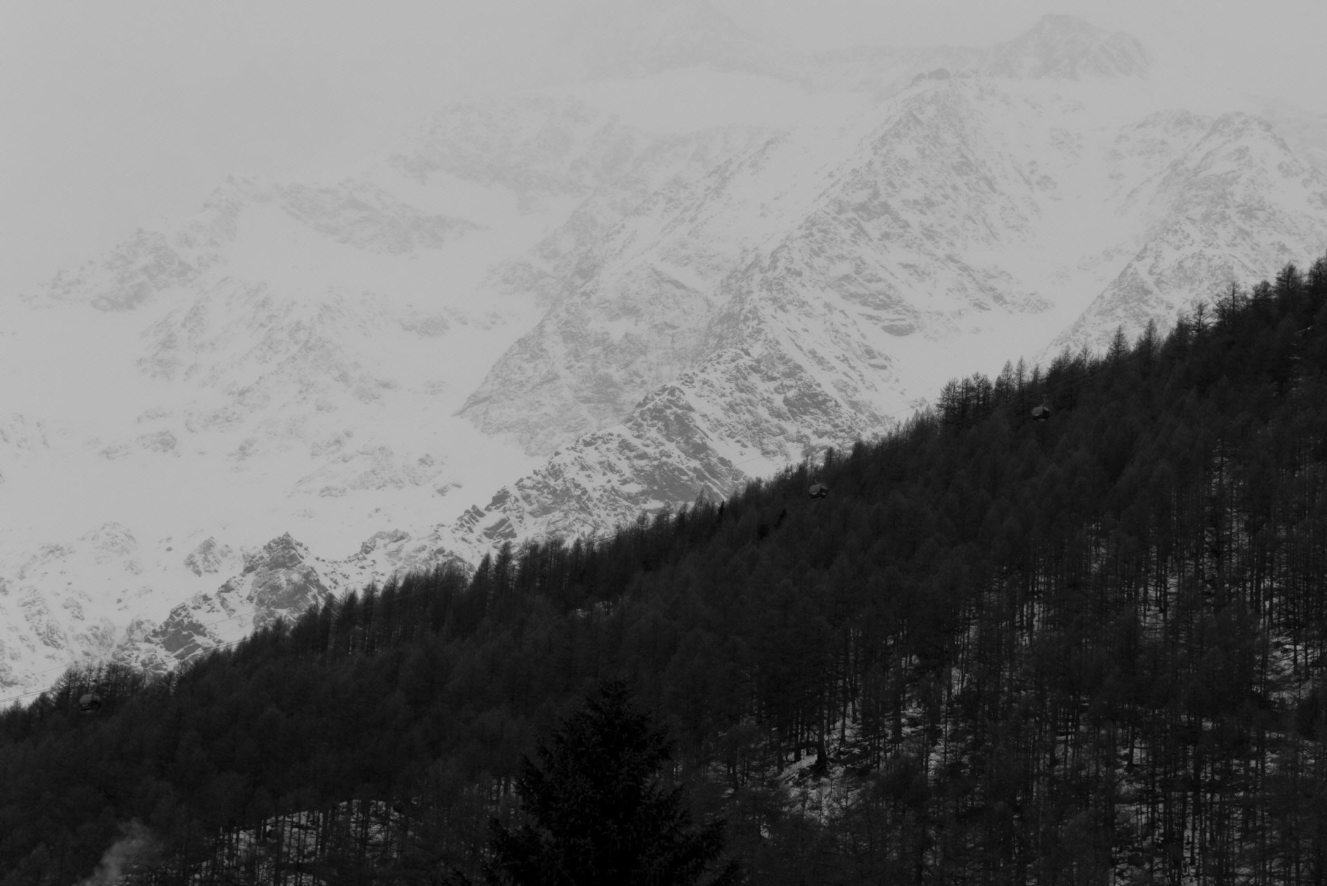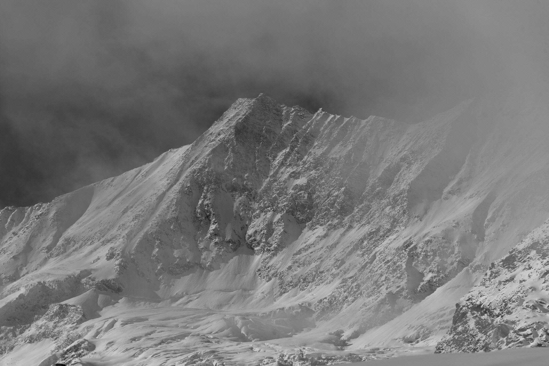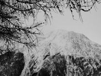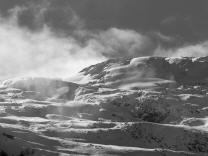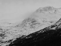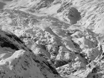Die Bilder der ersten Serie entstanden am zweiten Tag meines 3-tägigen Aufenthalts in Saas-Fee. Das schwache Licht und der spärliche Schnee sorgten für eine sehr graphische Stimmung. Wunderbar für schwarz/weiss: Es gab sowieso kaum Farbe.