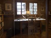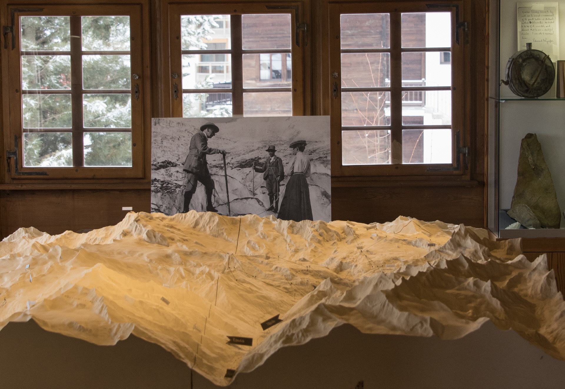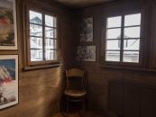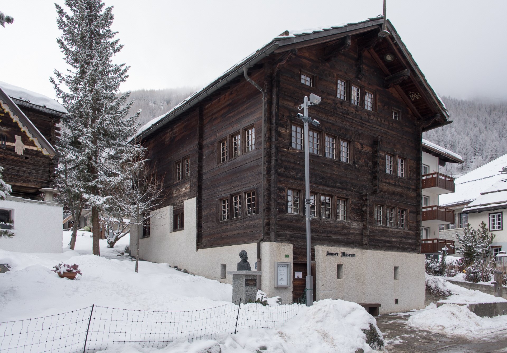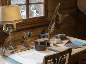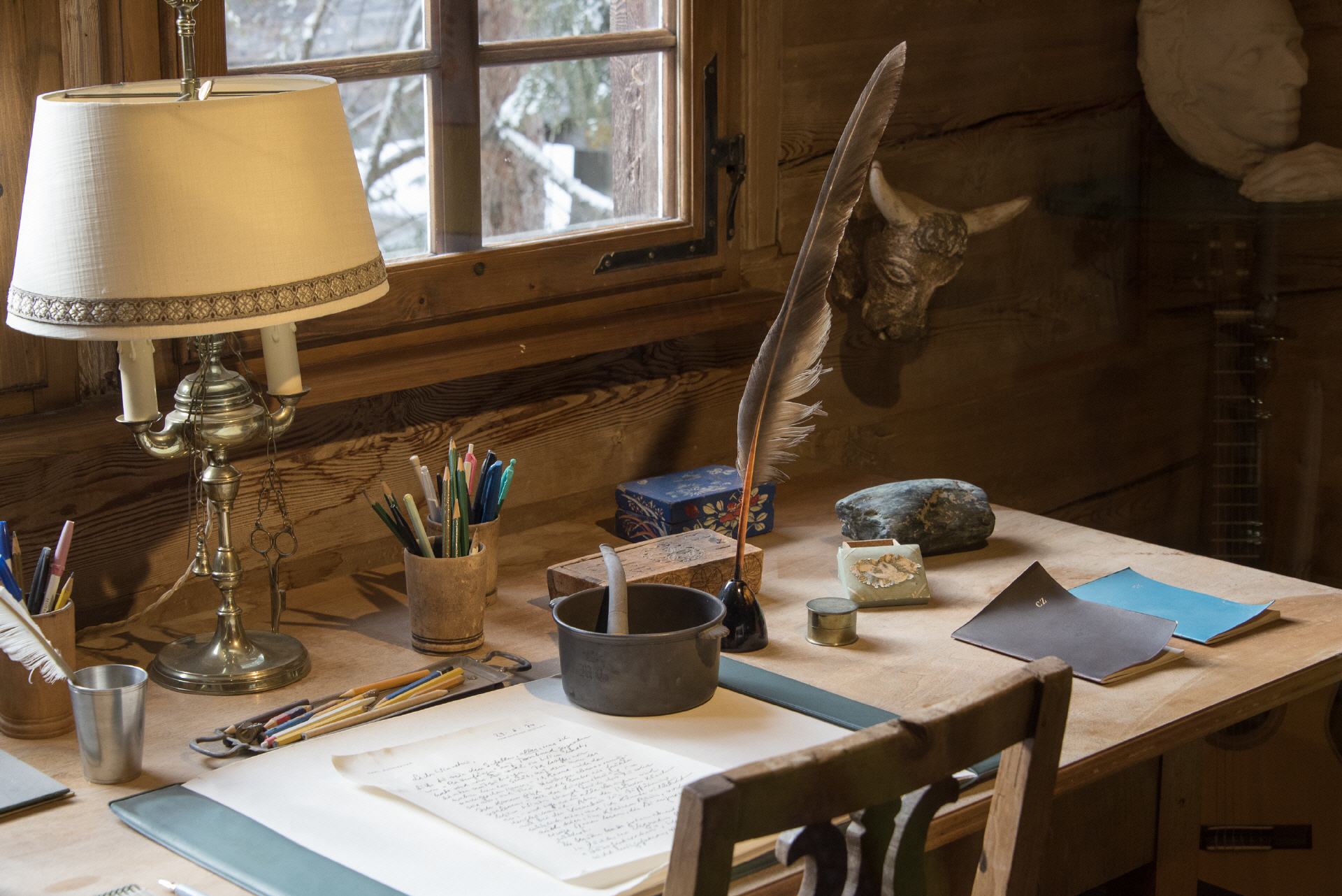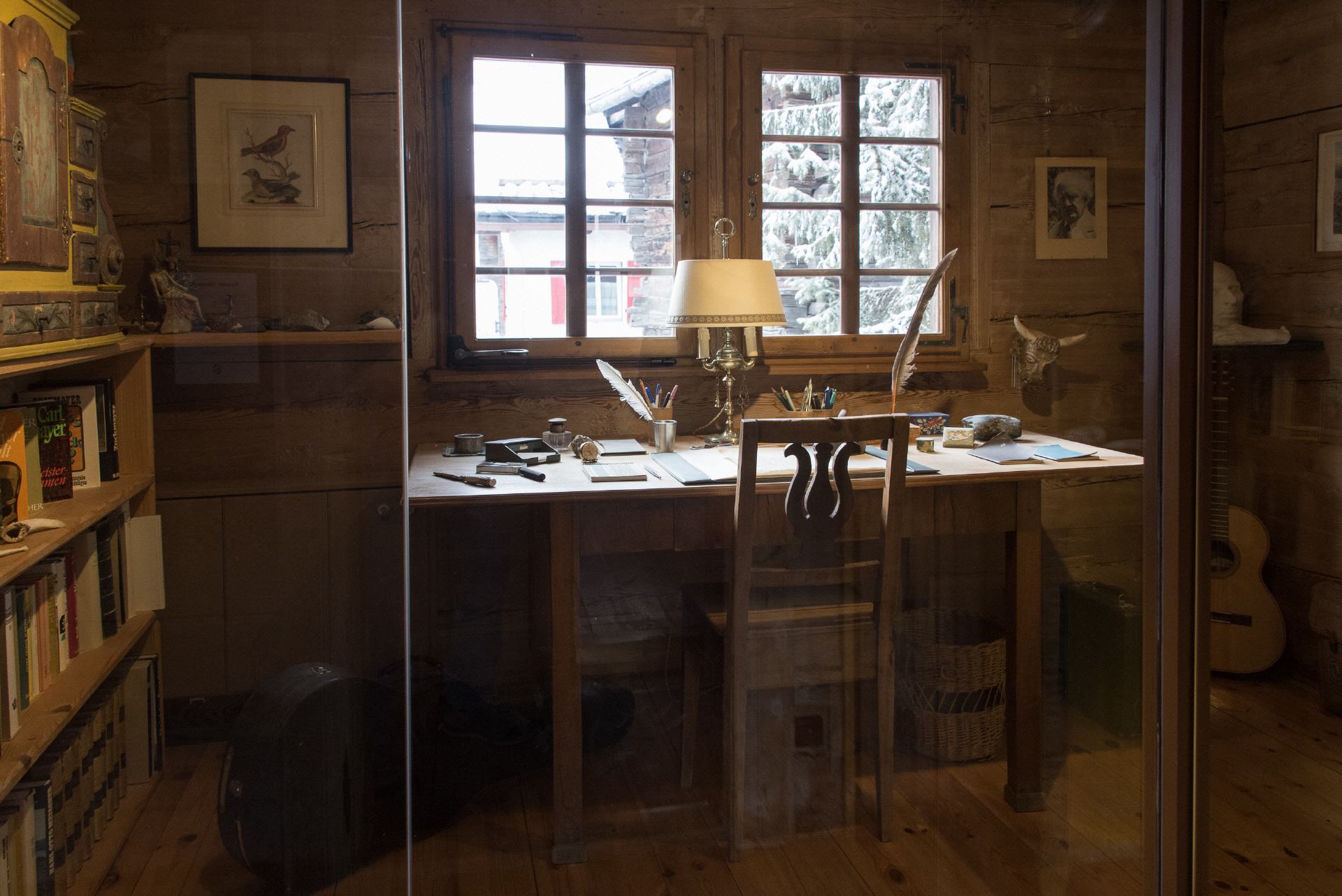 Das Bild mit dem Pult und der schönen Schreibfeder zeigt das Arbeitszimmer des deutschen Schriftstellers Carl Zuckmayer. Er war Ehrenbürger in Saas-Fee und lebte dort ab 1957 bis zu seinem Tod im Jahr 1977.